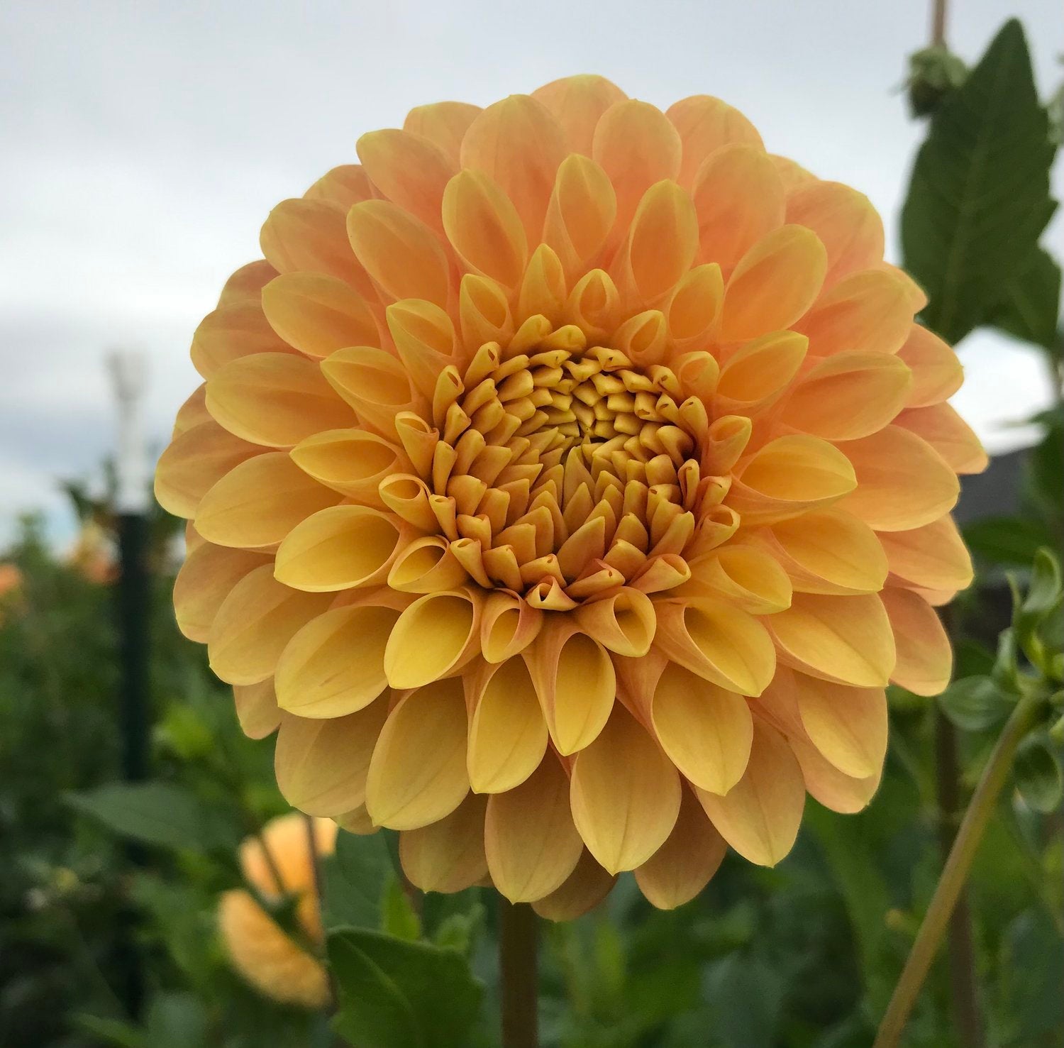 A radiant formal decorative dahlia with golden yellow blooms that softly fade into peach, bringing warmth and brightness to any bouquet.