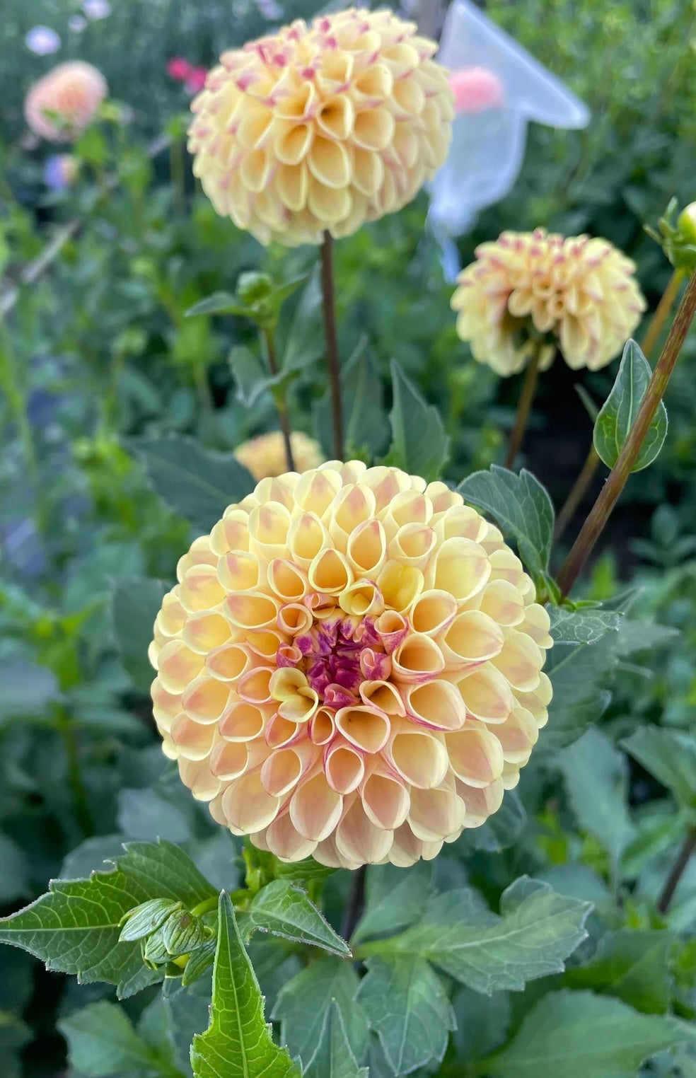A vibrant ball dahlia with golden yellow blooms and striking hints of magenta at the center, making it a fun and prolific addition to any garden.