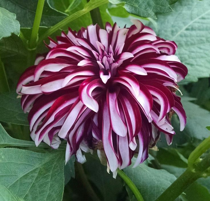 A striking dark bicolor stellar dahlia with rich maroon-black petals accented by bright white centers and tips, creating a truly distinctive bloom.