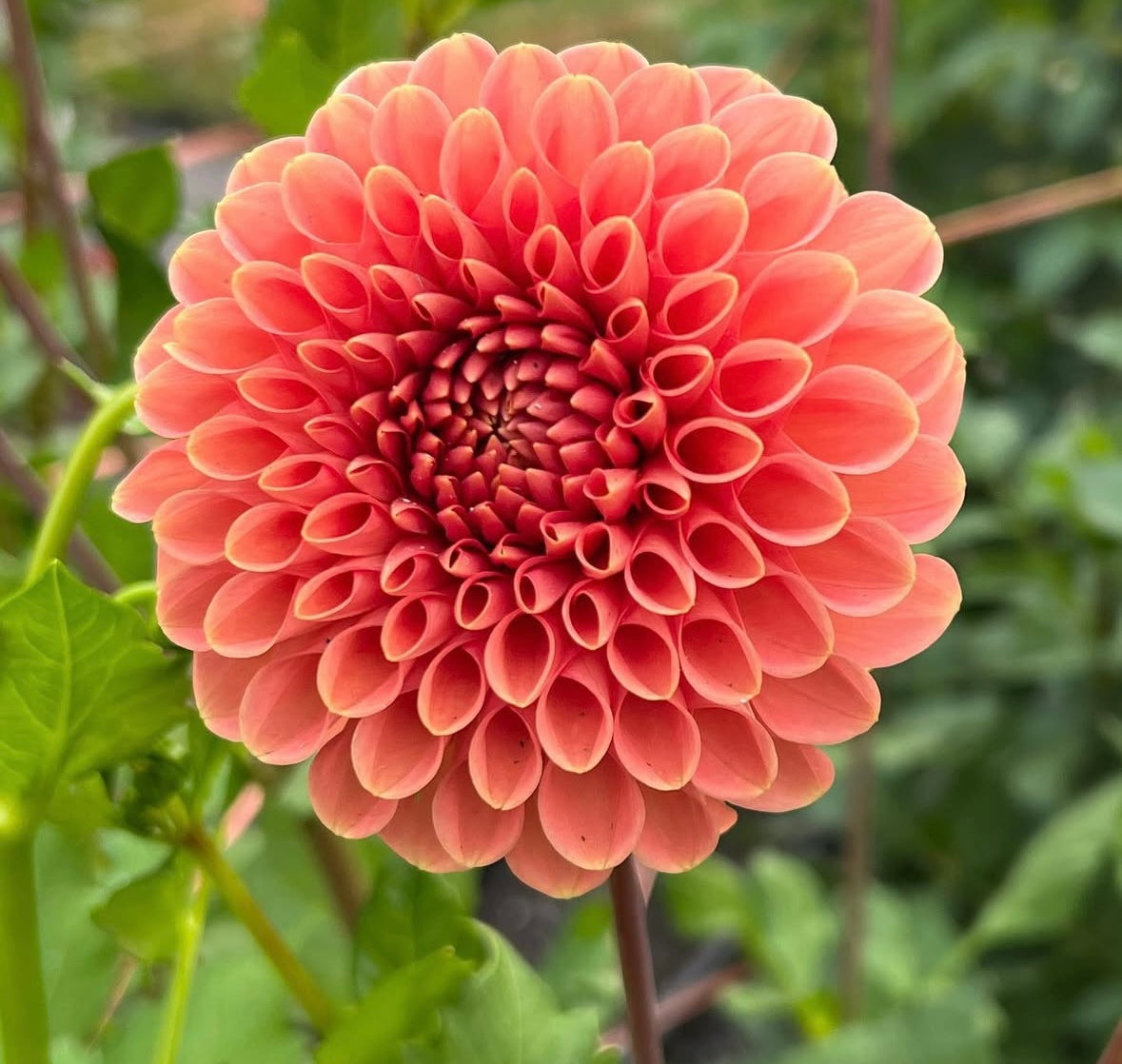 A vibrant, juicy persimmon-colored miniature dahlia with elegantly shaped petals, bringing irresistible beauty to any garden or bouquet.