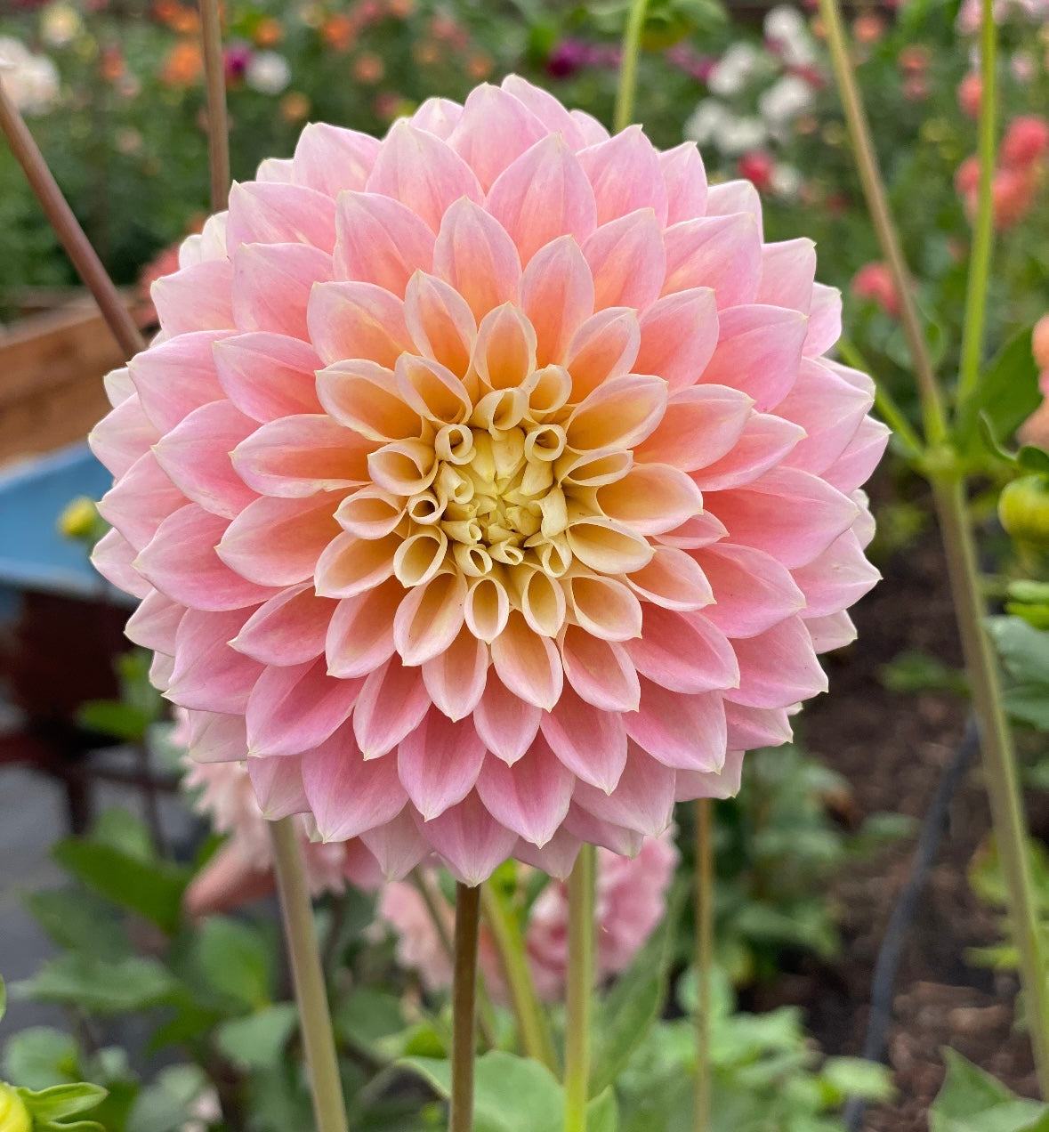 A stunning formal decorative dahlia with beautiful pink blooms and a glowing yellow center, shifting to a soft blush in the summer heat.